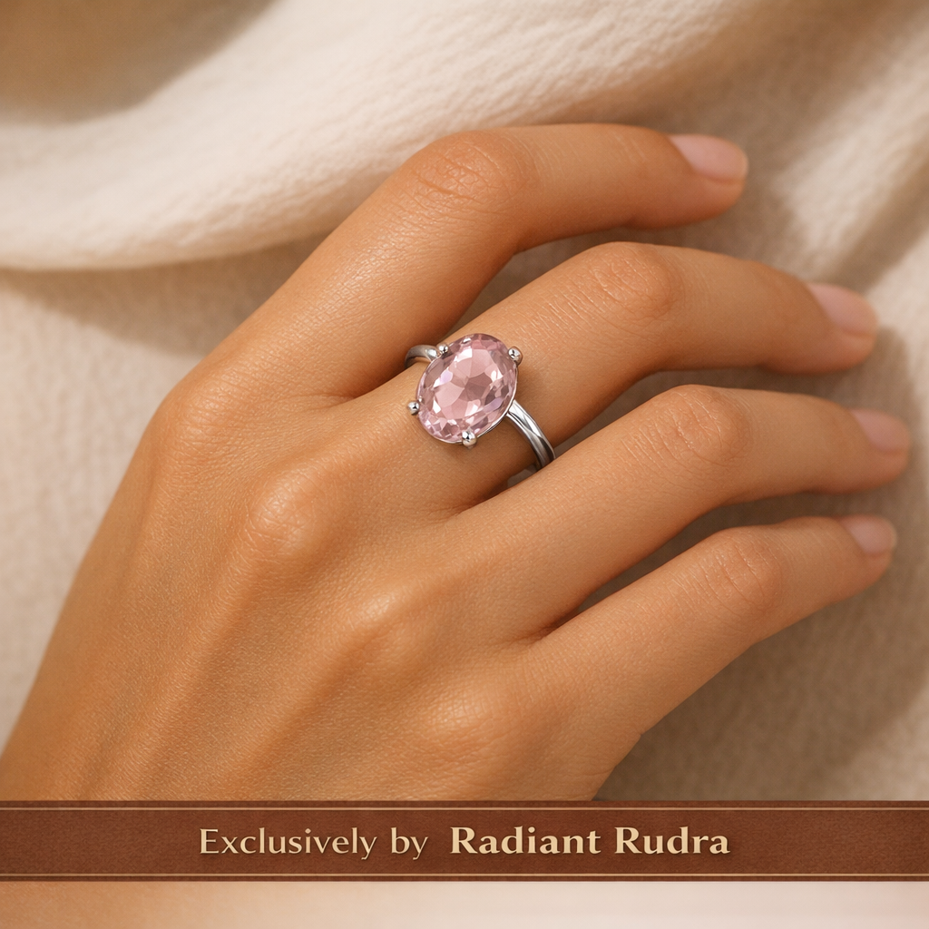Experience the gentle, soothing energy of love with this beautifully crafted Rose Quartz Ring, set in a premium silver band. Featuring a natural, certified rose quartz gemstone, this ring is personally abhimantrit (energized through sacred rituals) to enhance its natural vibrations. Known as the stone of love and emotional healing, rose quartz is believed to attract love, promote self-compassion, and restore harmony in relationships.